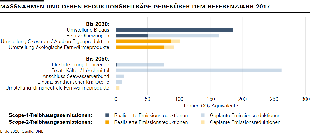 Die Ziele des Transitionsplans sollen durch eine Mischung unterschiedlicher Massnahmen erreicht werden, die auf Substitution und technische Verbesserungen mit wesentlichen Emissionsreduktionen fokussieren (siehe Grafik 2 unter «Downloads»). Massnahmen im Zeithorizont bis 2030 umfassen u. a. den Ersatz von Ölheizungen oder die Umstellung der Gasheizungen auf den Bezug von Biogas. Längerfristige Pläne sehen beispielsweise den vollständigen Ersatz klimaschädlicher Kältemittel oder den Anschluss weiterer Gebäude an den Seewasserverbund vor. Wichtige Schritte im Berichtsjahr waren die Steigerung der Energieeffizienz in Gebäuden, die Nutzung emissionsarmer Fahrzeuge sowie die Inbetriebnahme einer Photovoltaikanlage.