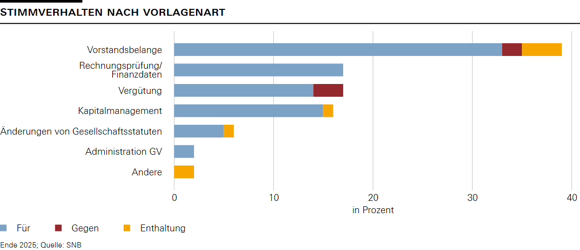 Zu den nicht-finanziellen Aspekten von Wertschriften privater Emittenten zählt auch die Ausübung der Stimmrechte bei Aktien. Die Nationalbank beschränkt sich dabei auf Fragen der Unternehmensführung und konzentriert sich auf mittel- und grosskapitalisierte Unternehmen aus Europa und arbeitet zu diesem Zweck mit externen Dienstleistern zusammen. In den USA übt die Nationalbank ihre Stimmrechte nicht aus. Die konkrete Stimmabgabe stützt sich auf die Stimmrechtsrichtlinie der SNB, die auf der SNB-Website publiziert ist. Im Jahr 2025 stimmte die SNB an 266 Generalversammlungen über insgesamt 4740 Traktanden ab. Die meisten Stimmrechtsabgaben entfielen auf Vorstandsbelange, insbesondere auf die Wahlen des Vorstands und des Aufsichtsrats sowie auf die Entlastung des Vorstands (siehe Grafik 1 unter «Downloads»).