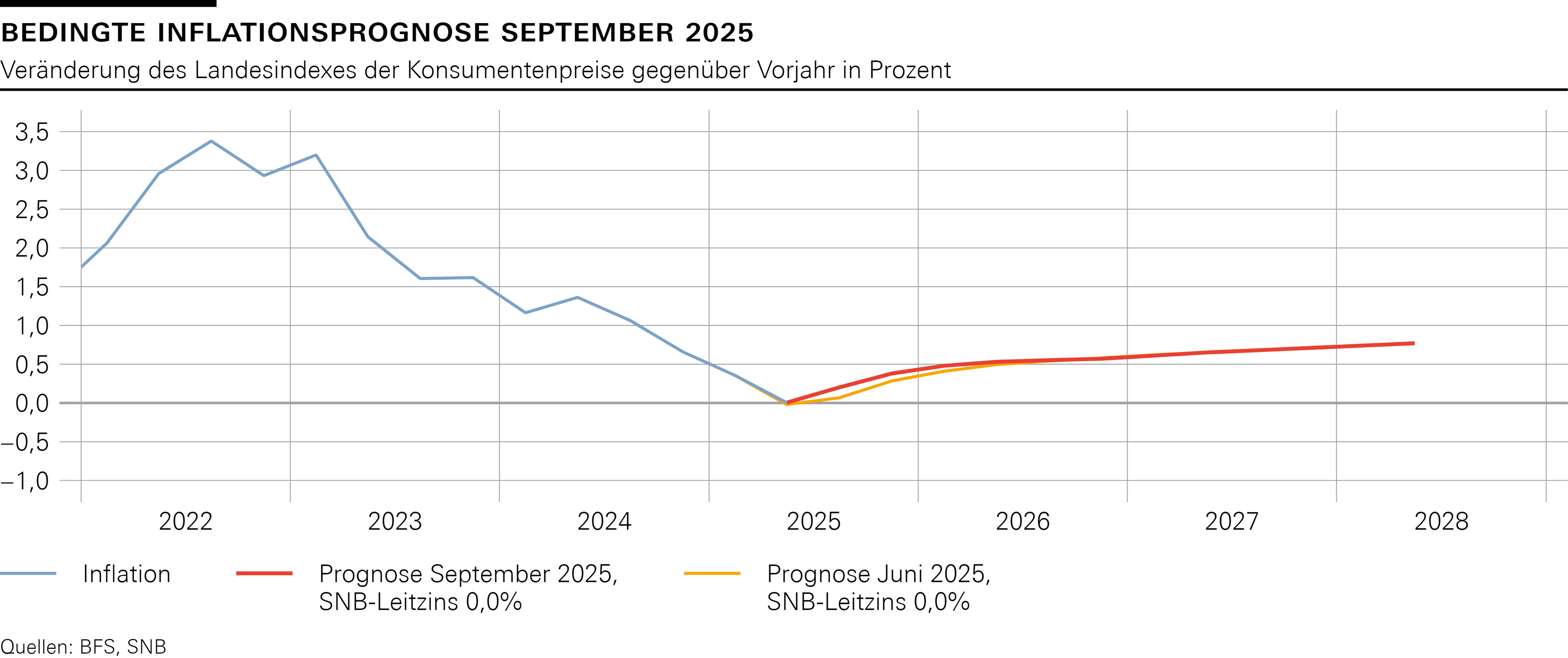Im Vergleich zum Juni ist der Inflationsdruck praktisch unverändert. Kurzfristig dürfte die Inflation zwar leicht höher ausfallen. In der mittleren Frist bleibt die bedingte Inflationsprognose aber unverändert. Die Prognose befindet sich über den gesamten Prognosezeitraum im Bereich der Preisstabilität (vgl. Grafik). Sie liegt im Jahresdurchschnitt wie im Vorquartal bei 0,2% für 2025, 0,5% für 2026 und 0,7% für 2027 (vgl. Tabelle). Die Prognose beruht auf der Annahme, dass der SNB-Leitzins über den gesamten Prognosezeitraum 0% beträgt.