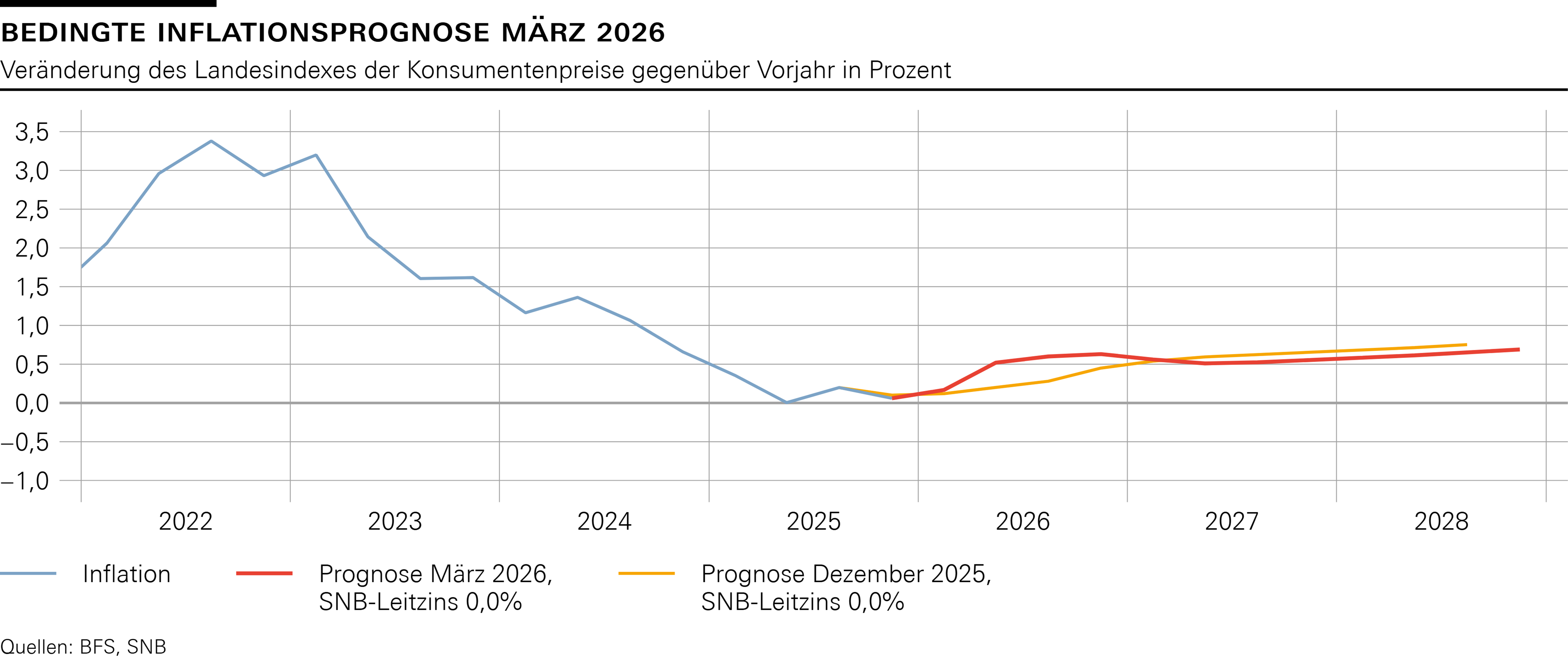 Mit den aufgrund der Eskalation im Nahen Osten gestiegenen Energiepreisen dürfte die Inflation in den nächsten Quartalen stärker zunehmen. Entsprechend liegt die bedingte Inflationsprognose in der kurzen Frist höher als im Dezember. In der mittleren Frist ist sie aufgrund des stärkeren Frankens leicht tiefer. Die Prognose befindet sich über den gesamten Prognosezeitraum im Bereich der Preisstabilität (vgl. Grafik). Sie liegt im Jahresdurchschnitt bei 0,5% für 2026, 0,5% für 2027 und 0,6% für 2028 (vgl. Tabelle). Die Prognose beruht auf der Annahme, dass der SNB-Leitzins über den gesamten Prognosezeitraum 0% beträgt.