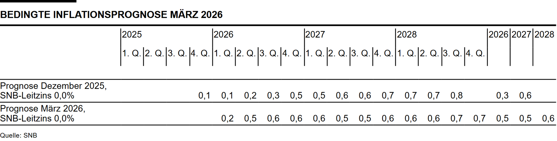Vertiefte Informationen zum geldpolitischen Entscheid finden sich in den Einleitenden Bemerkungen des Direktoriums (verfügbar auf der SNB-Website ab 19. März 2026, 10:00 Uhr).