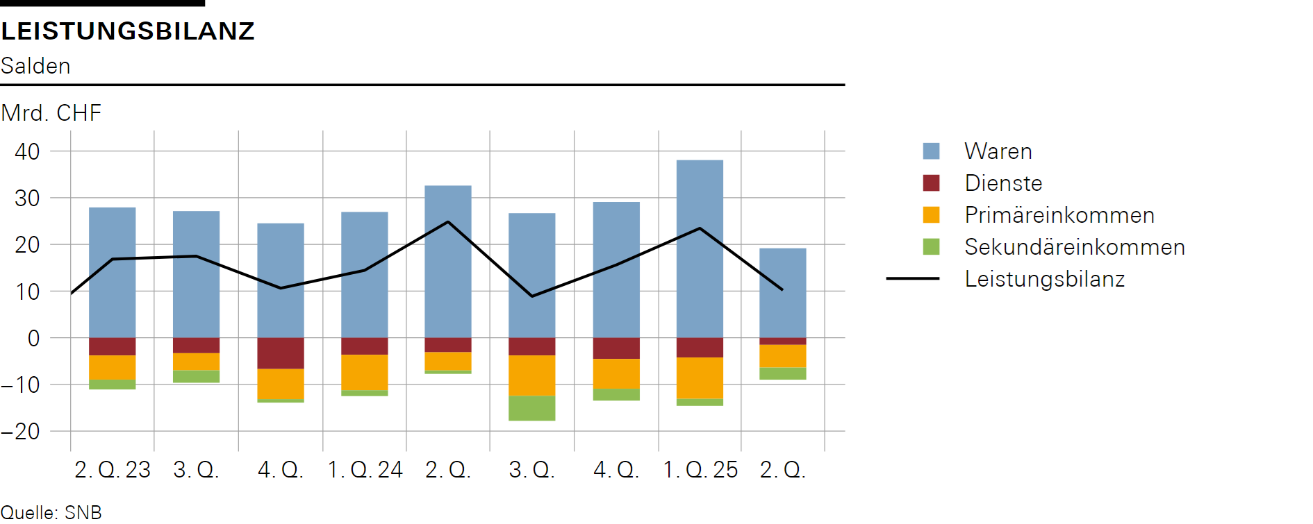 Im 2. Quartal 2025 belief sich der Leistungsbilanzüberschuss auf 10 Mrd. Franken. Er lag