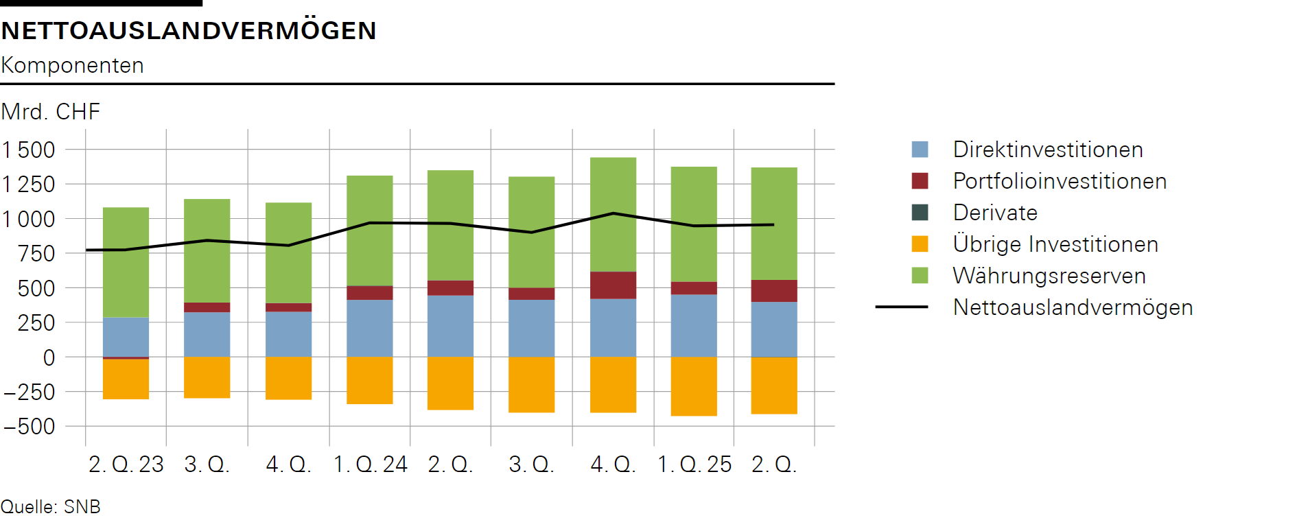 Das Nettoauslandvermögen nahm im 2. Quartal 2025 gegenüber dem Vorquartal um 9 Mrd. auf 956 Mrd. Franken zu, weil die Bestände der Passiven stärker zurückgingen als diejenigen der Aktiven.