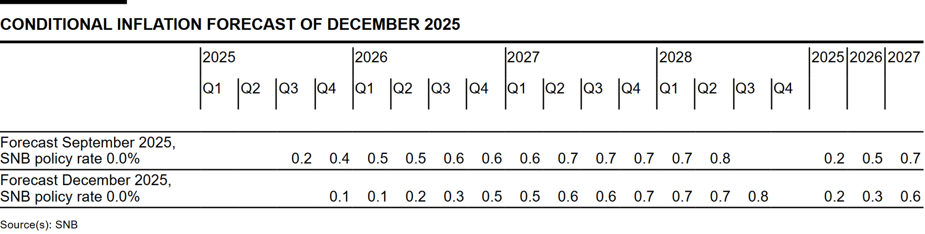 Inflationary pressure in the medium term is virtually unchanged compared to the previous quarter. Although the conditional inflation forecast is somewhat lower in the short term than in September, there is only little change in the medium term. The forecast is within the range of price stability over the entire forecast horizon (cf. chart). It puts average annual inflation at 0.2% for 2025, 0.3% for 2026 and 0.6% for 2027 (cf. table). The forecast is based on the assumption that the SNB policy rate is 0% over the entire forecast horizon.