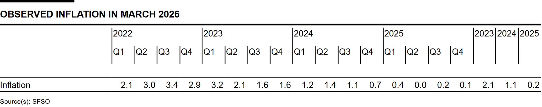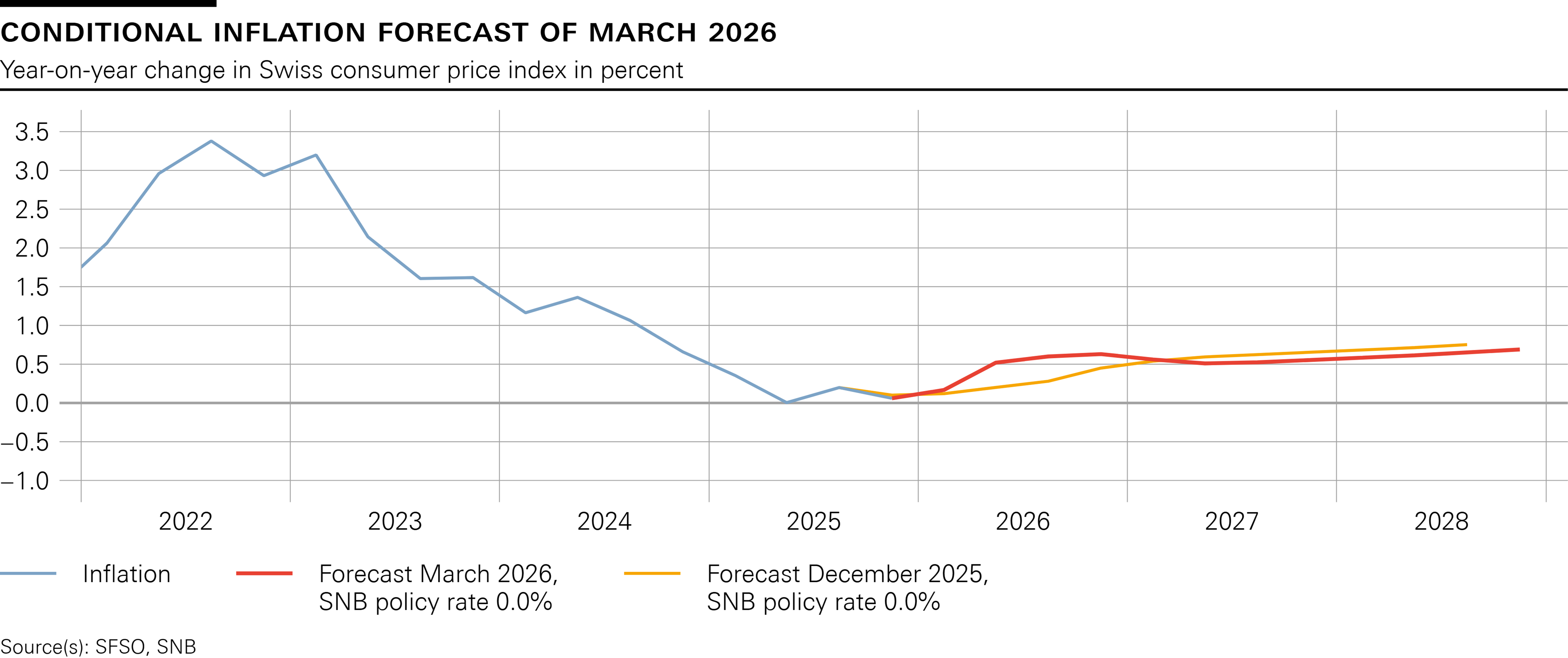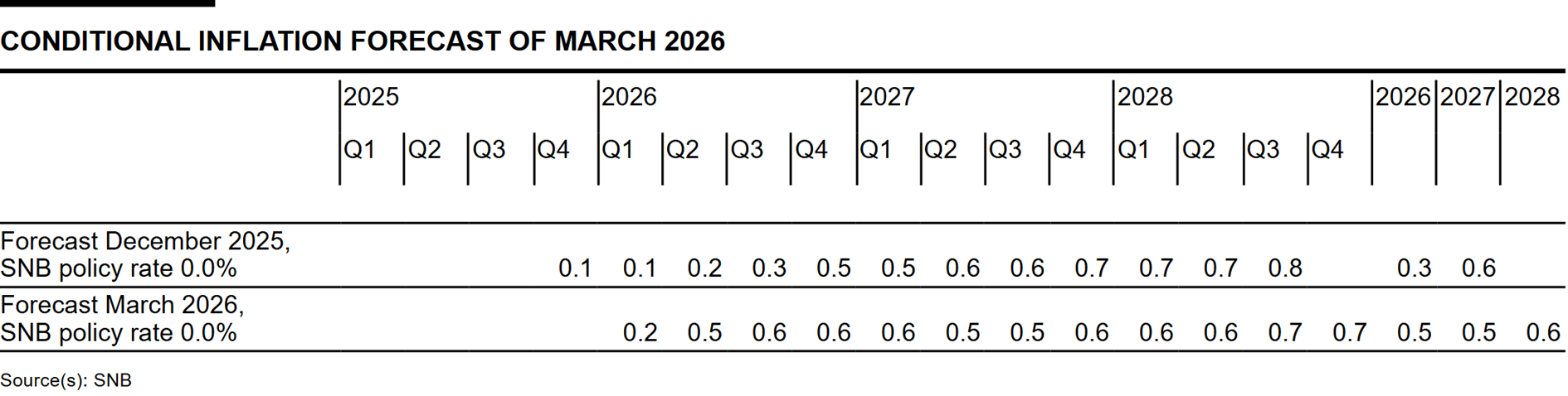 With the rise in energy prices due to the escalation in the Middle East, inflation is likely to increase more strongly in the coming quarters. As a result, the conditional inflation forecast in the short term is higher than in December. In the medium term, it is slightly lower due to the stronger Swiss franc. The forecast is within the range of price stability over the entire forecast horizon (cf. chart). It puts average annual inflation at 0.5% for 2026, 0.5% for 2027 and 0.6% for 2028 (cf. table). The forecast is based on the assumption that the SNB policy rate is 0% over the entire forecast horizon.