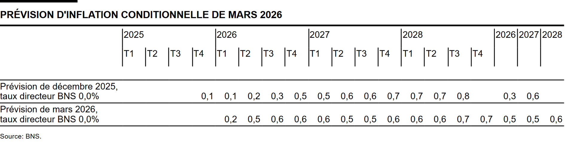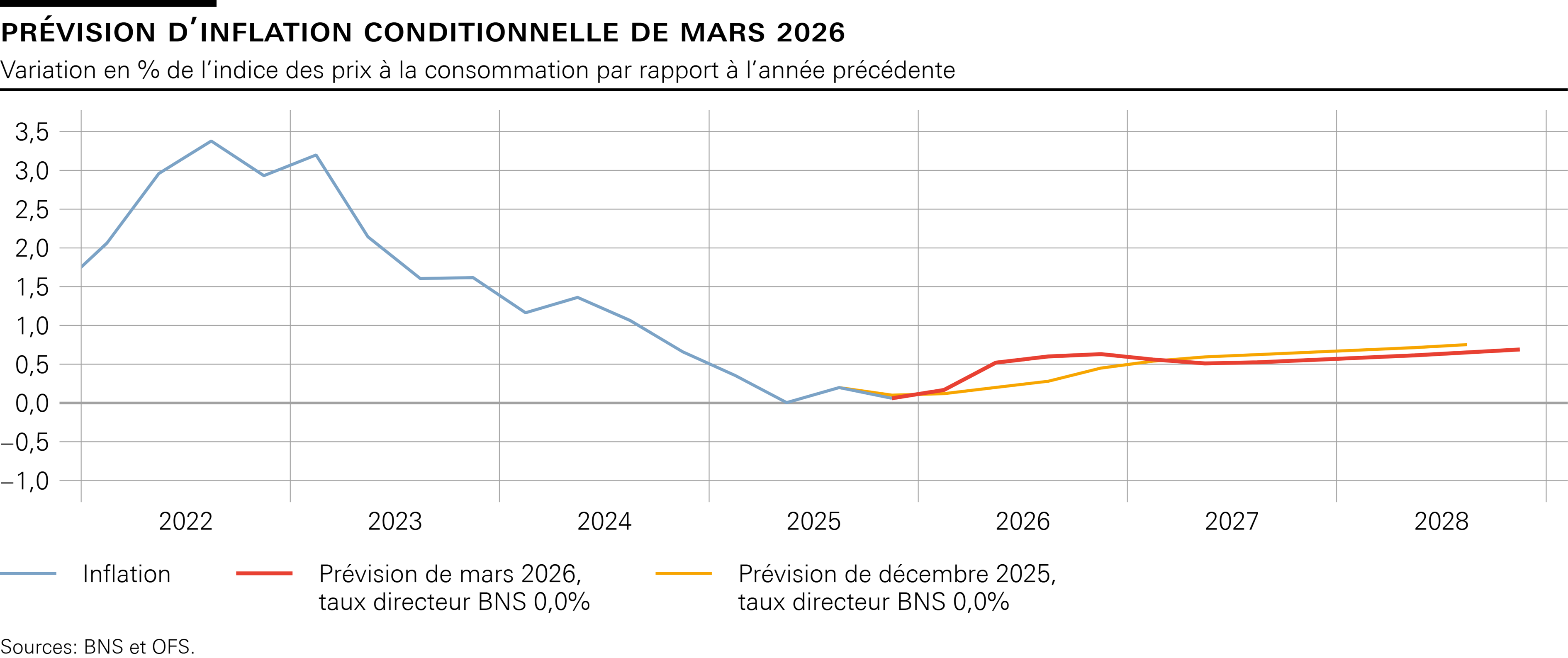 Avec la hausse des prix de l'énergie due à l'escalade au Moyen-Orient, l'inflation devrait augmenter de façon plus marquée au cours des prochains trimestres. À court terme, la prévision d'inflation conditionnelle est ainsi plus élevée qu'en décembre. À moyen terme, elle a légèrement baissé sous l'effet de l'appréciation du franc. Elle se situe dans la plage de stabilité des prix pour toute la période sur laquelle elle porte (voir graphique). En moyenne annuelle, elle s'établit à 0,5% pour 2026, à 0,5% pour 2027 et à 0,6% pour 2028 (voir tableau). La prévision d'inflation conditionnelle repose sur l'hypothèse d'un taux directeur de la BNS maintenu constant à 0% sur toute la période de prévision.
