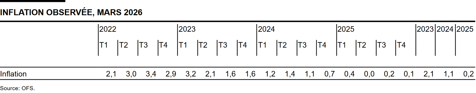 La Banque nationale suisse (BNS) maintient son taux directeur à 0%. Les avoirs à vue détenus par les banques à la BNS se voient appliquer, jusqu'à un seuil défini, le taux directeur de la BNS. Pour la part des avoirs à vue dépassant ce seuil, le taux appliqué continue d'être inférieur de 25 points de base au taux directeur. Compte tenu du conflit au Moyen-Orient, la Banque nationale est davantage disposée à intervenir sur le marché des changes pour contrer une appréciation rapide et excessive du franc, qui menacerait la stabilité des prix en Suisse.