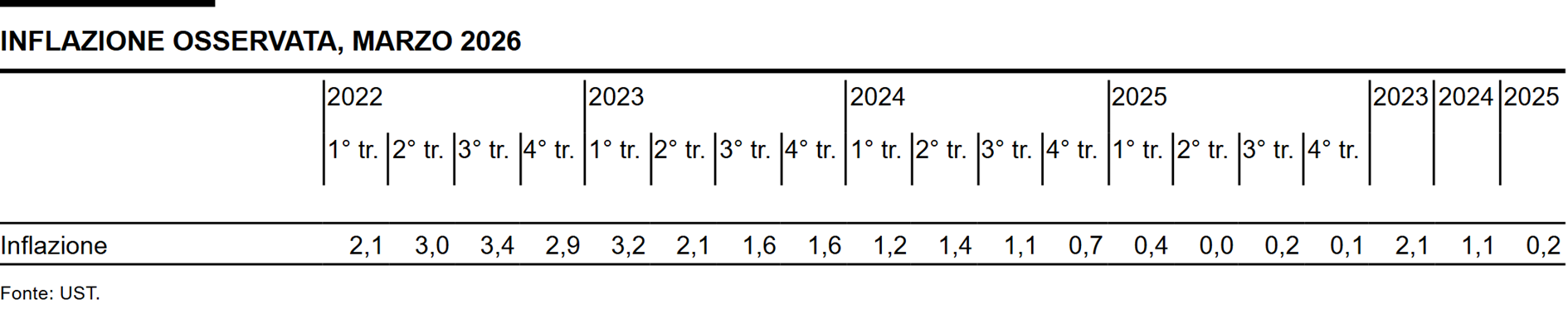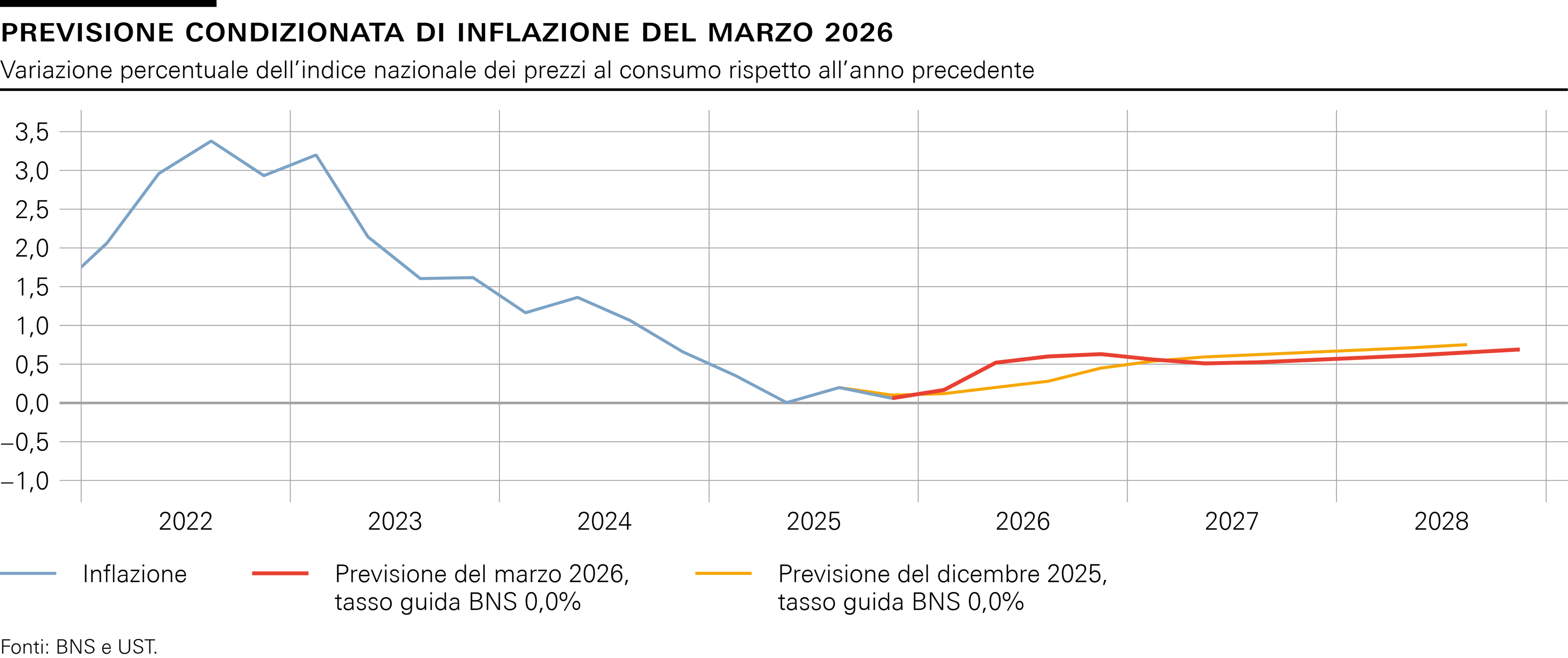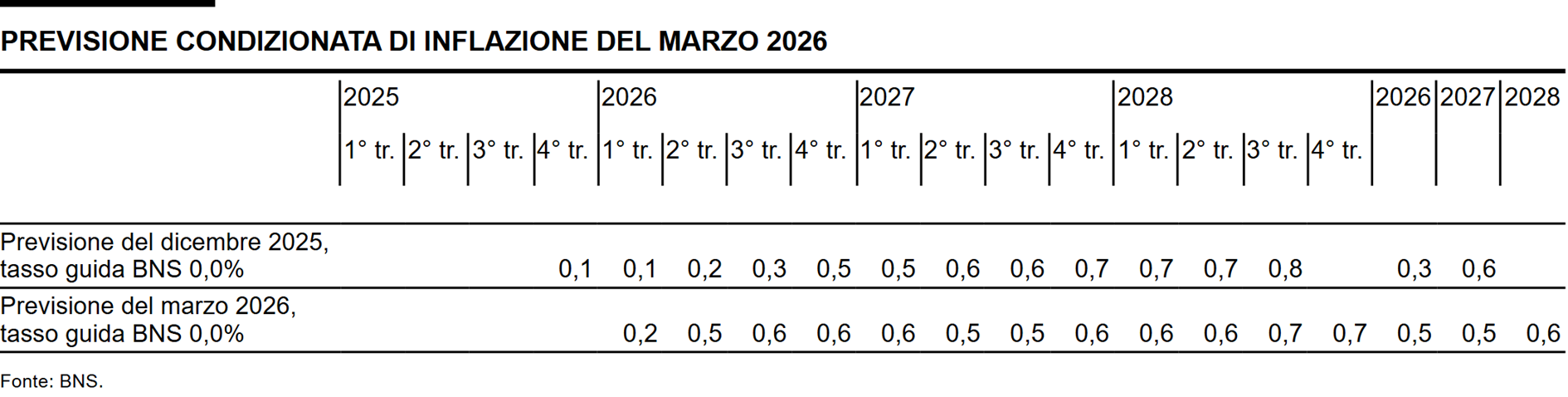 A causa del rincaro dell'energia dovuto al conflitto in Medio Oriente, nei prossimi trimestri l'inflazione dovrebbe aumentare a un ritmo più sostenuto. Di conseguenza, a breve termine la previsione condizionata di inflazione è superiore a quella formulata in dicembre, mentre a medio termine è di poco inferiore per effetto dell'apprezzamento del franco. Essa si attesta lungo l'intero orizzonte previsivo nell'area di stabilità dei prezzi (cfr. grafico). Nella media annua si colloca allo 0,5% per il 2026, allo 0,5% per il 2027 e allo 0,6% per il 2028 (cfr. tabella). La previsione si basa sull'assunto che il tasso guida BNS rimanga pari allo 0% lungo l'intero orizzonte previsivo.